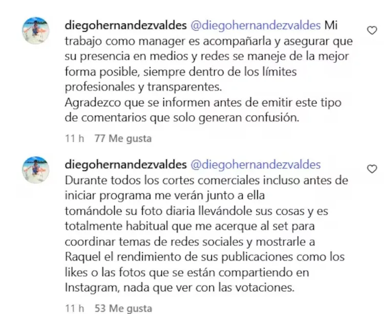“Mi trabajo como manager es acompañarla y asegurar que su presencia en medios y redes se maneje de la mejor forma posible, siempre dentro de los límites profesionales y transparentes”, explicó Hernández en un comentario citado por La Cuarta.