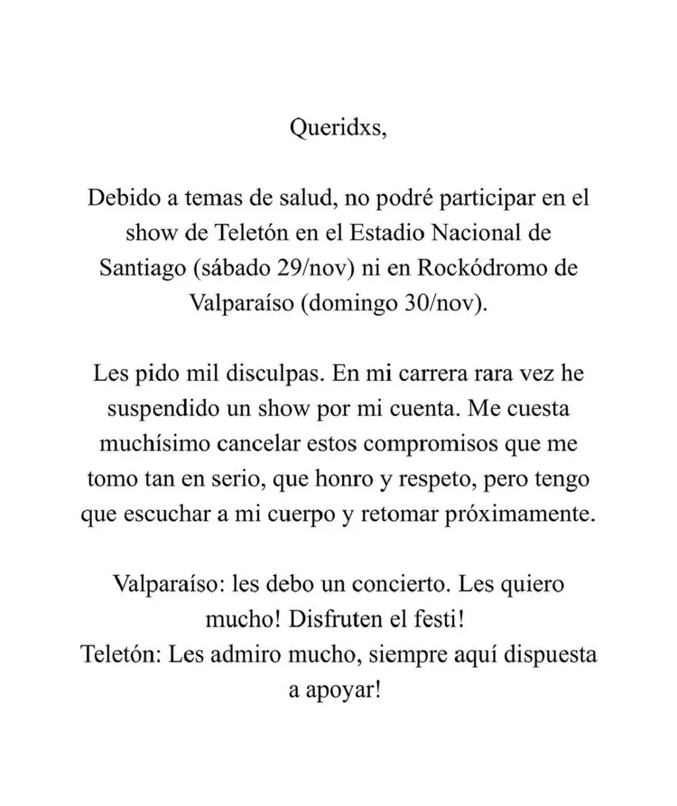 La cantante utilizó sus redes sociales para comunicar la decisión, aclarando que tanto su show en el Estadio Nacional de Santiago el sábado 29 de noviembre, como su participación en Rockódromo de Valparaíso el domingo 30, quedan suspendidos temporalmente.