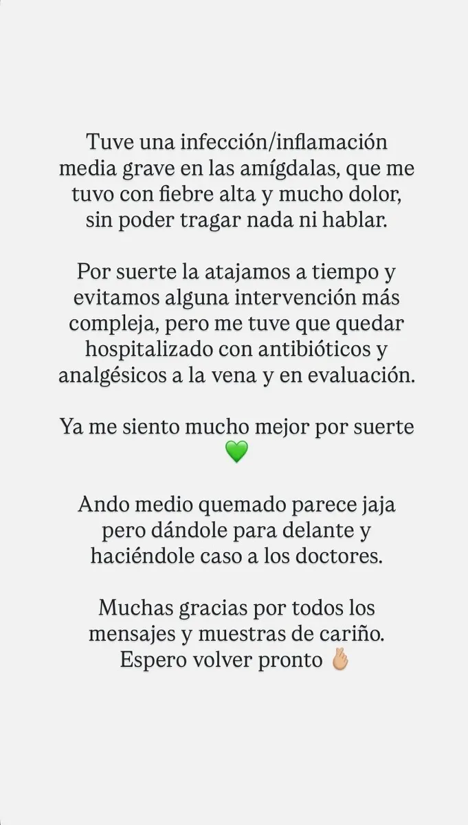 Este lunes, el edil detalló el origen del problema: una fuerte infección e inflamación de amígdalas, que le provocó fiebre intensa, dolor y dificultades tanto para tragar como para hablar. Un cuadro que avanzó rápido y que, según expresó, fue atendido “justo a tiempo”.