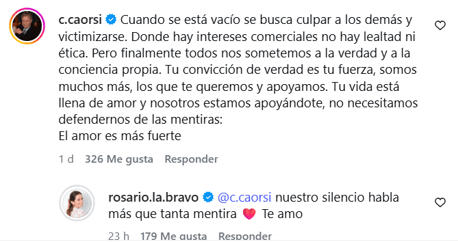 Rosario Bravo no tardó en reaccionar y respondió de manera directa: “Nuestro silencio habla más que tanta mentira. Te amo”, frase que fue interpretada como un respaldo total a su esposo y una indirecta al animador.