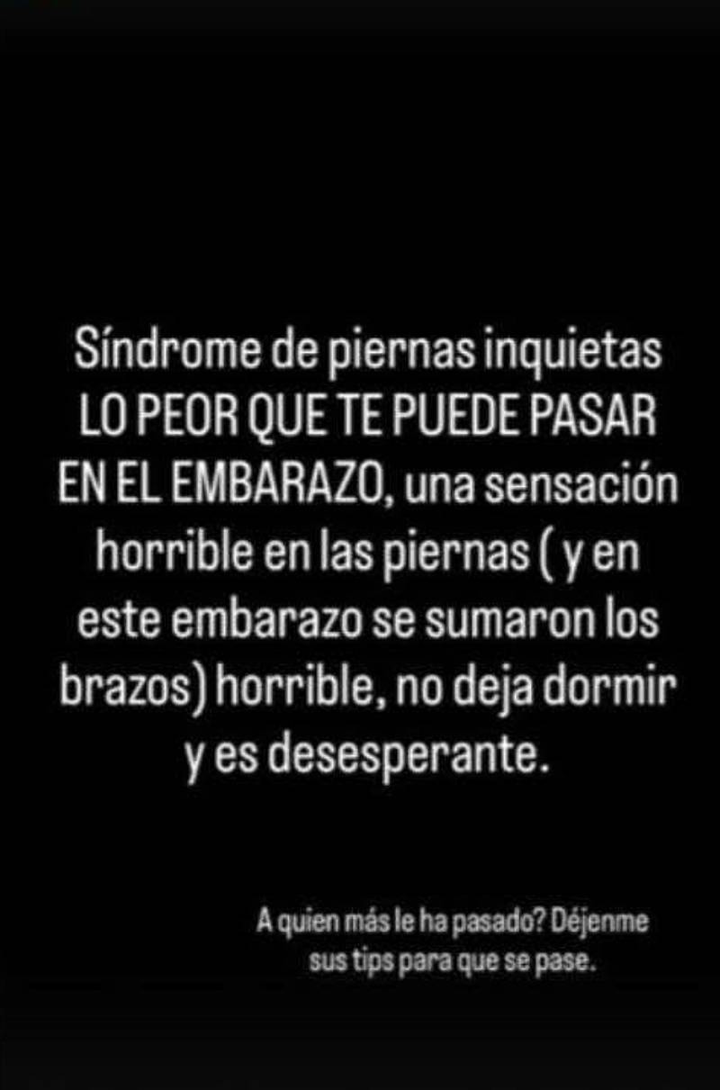 Mediante su cuenta de Instagram, Rocío explicó que fue diagnosticada con síndrome de piernas inquietas, asegurando que es “lo peor que te puede pasar en el embarazo”. Según relató, se trata de una sensación constante y muy incómoda en las extremidades.