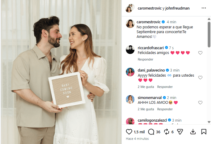 ​Como era de esperar, la publicación se llenó rápidamente de miles de «likes» y cientos de comentarios cargados de buenos deseos. Tanto fanáticos como colegas del mundo del espectáculo celebraron esta nueva etapa personal que atraviesa la pareja, destacando la alegría que irradian en cada una de sus apariciones públicas.