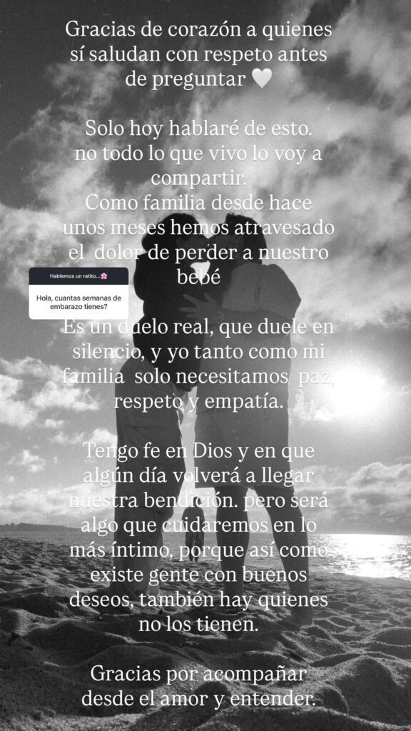 “Como familia, desde hace unos meses hemos atravesado el dolor de perder a nuestro bebé. Es un duelo real, que duele en silencio. Y yo, tanto como mi familia, solo necesitamos paz, respeto y empatía”, agregó.