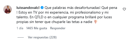 Como era de esperarse, el extracto de la entrevista se volvió viral en cuestión de minutos. Fue a través de la cuenta de Instagram del portal Todo se sabe donde Luis Sandoval decidió romper el silencio y enfrentar a su excolega con un comentario que sacó chispas. “¡Qué palabras más desafortunadas! ¡Qué pena! Estoy en TV por mi experiencia, mi profesionalismo y mi talento”, escribió el periodista, visiblemente dolido por los dichos de quien alguna vez fue su compañera de panel.
