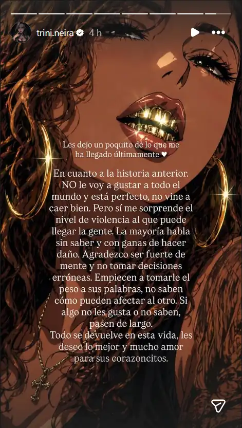 Con una madurez que sorprendió a muchos, Trinidad aclaró que entiende que su figura no sea del agrado de todos, pero recalcó que el límite es la violencia. “No le voy a gustar a todo el mundo y está perfecto, no vine a caer bien”, sinceró en su publicación. Sin embargo, hizo hincapié en la peligrosidad de estos comentarios: “Me sorprende el nivel de violencia al que puede llegar la gente. La mayoría habla sin saber y con ganas de hacer daño”, disparó contra quienes la juzgan sin conocer la interna de la polémica.