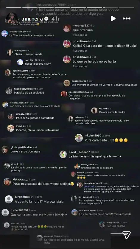 A través de sus historias de Instagram, la joven mostró la cruda realidad que vive en su bandeja de entrada. La imagen compartida por la influencer reveló decenas de mensajes cargados de violencia y denostaciones personales, muchos de los cuales hacían referencia directa a los rumores de un supuesto affaire con el personal trainer. “Patas negras”, “ordinaria” y “parásito de la sociedad” fueron solo algunos de los insultos que Trini decidió visibilizar para graficar el nivel de hostilidad que enfrenta a diario.